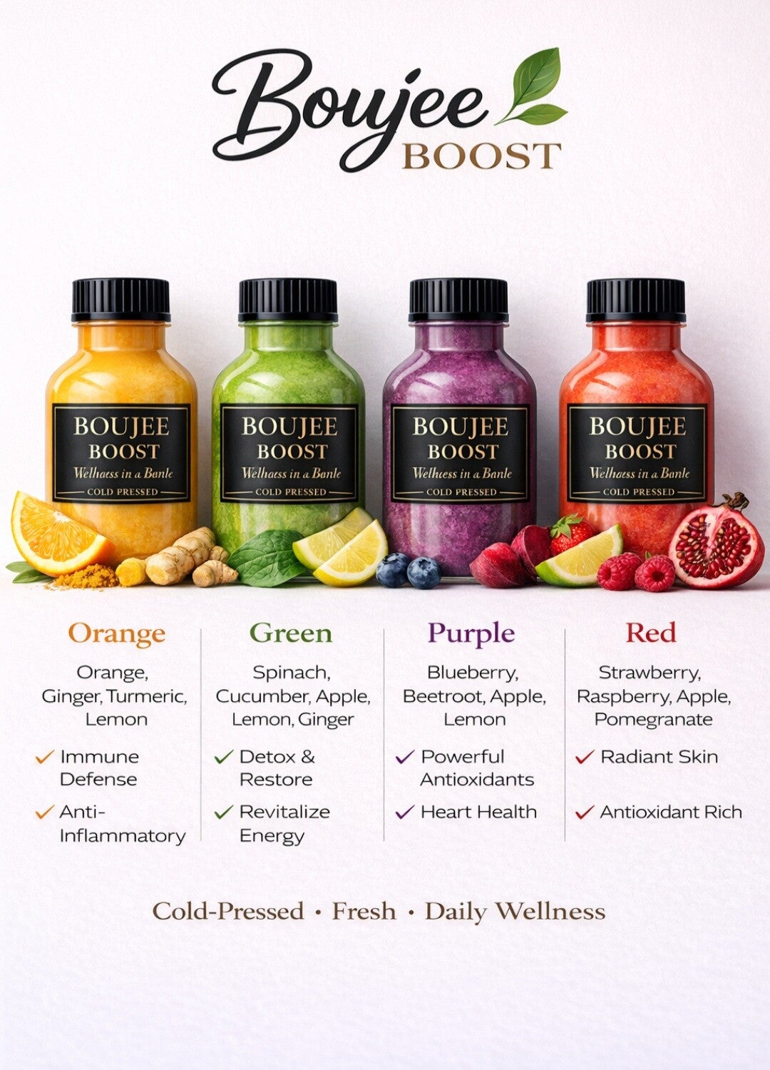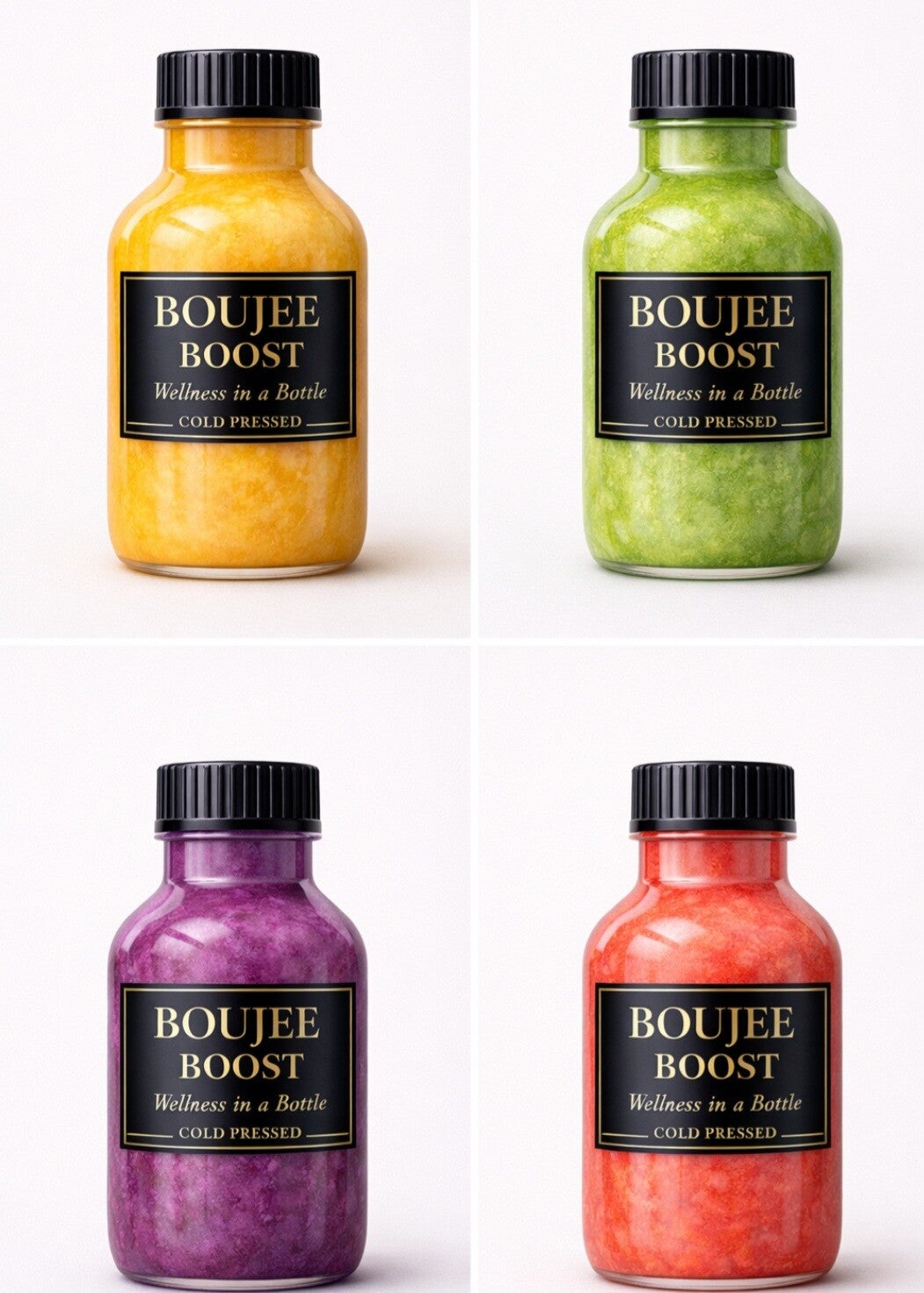 Our journey is built on passion, precision, and a commitment to using fresh, powerful ingredients that deliver real benefits. At Boujee Boost, wellness isn’t just a product, it’s a lifestyle.